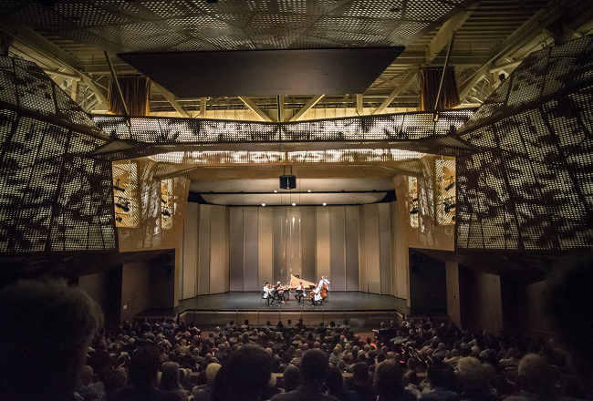 The Spieker Center for the Arts is the home of Music@Menlo, situated at the heart of the Menlo School campus. The hall has 384 seats, all with clear sightlines and close acoustic proximity to the stage. It also features meticulous acoustic design to meet the most rigorous industry standards, bright and spacious lobby space, and state-of-the-art recording and technical facilities.